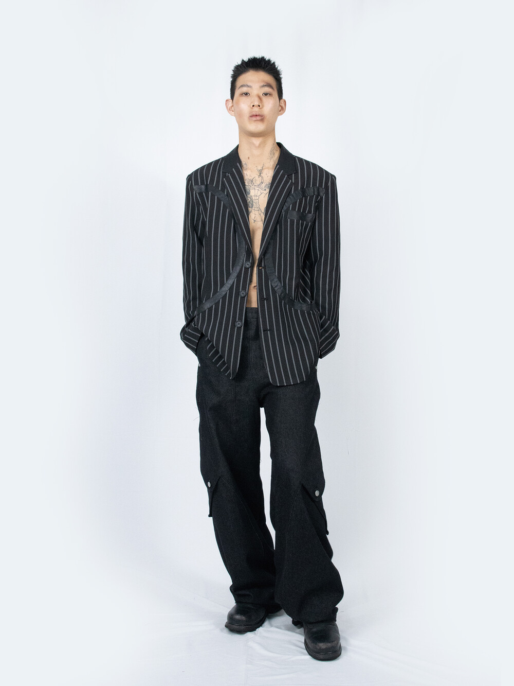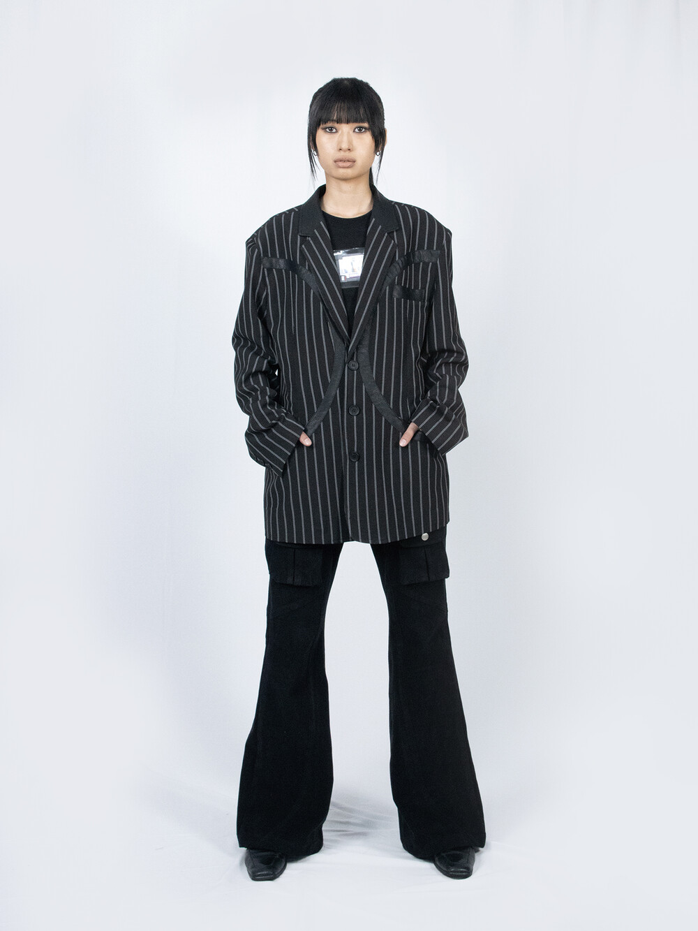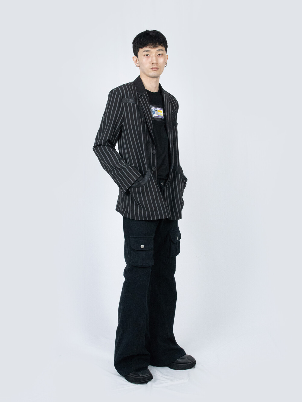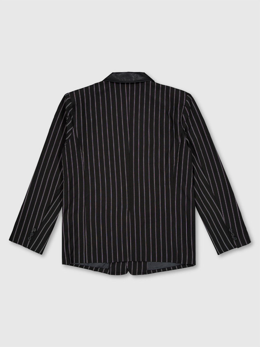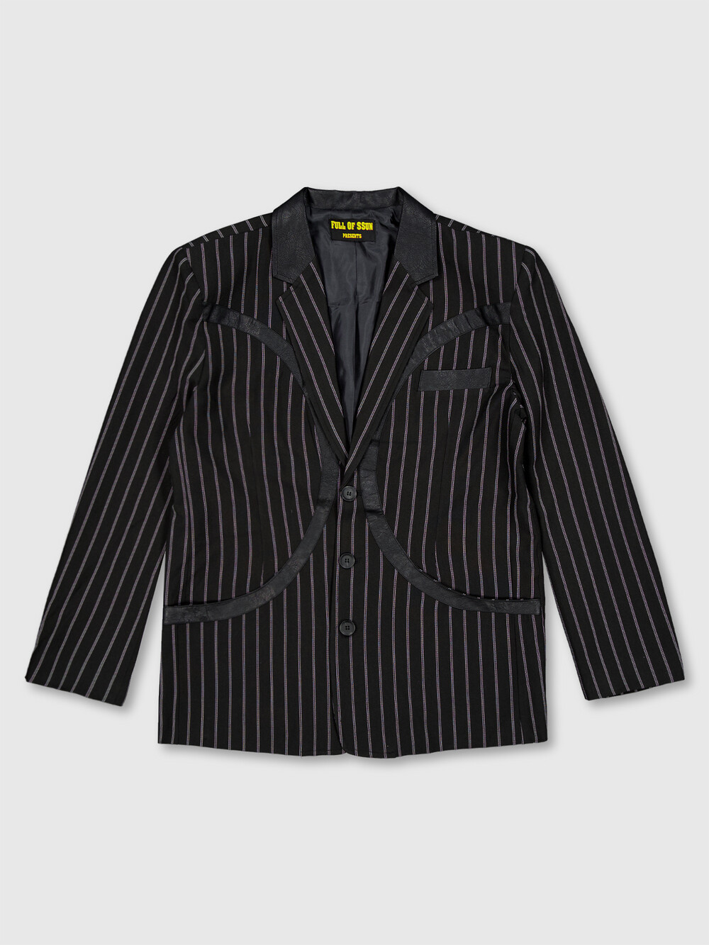 - A striped fabric blazer featuring FULLOFSSUN’s signature circle detail in a leather patch.
