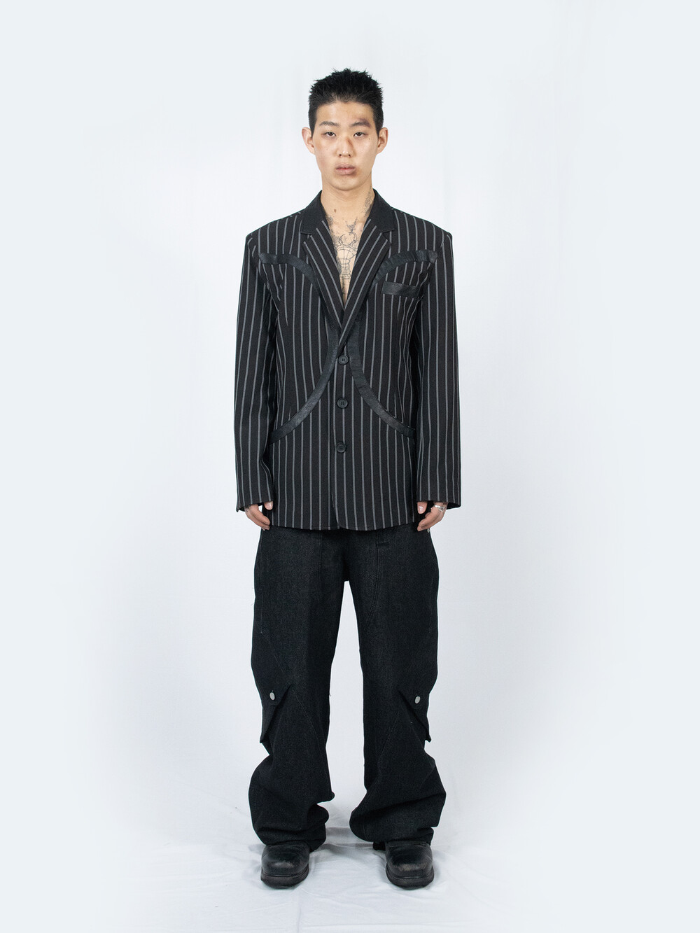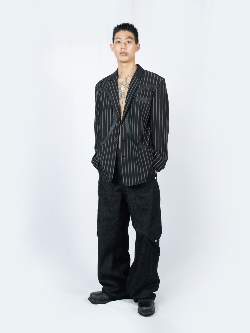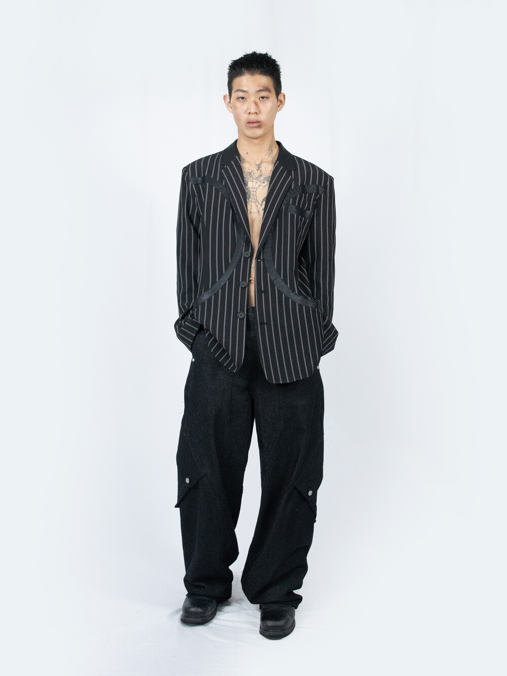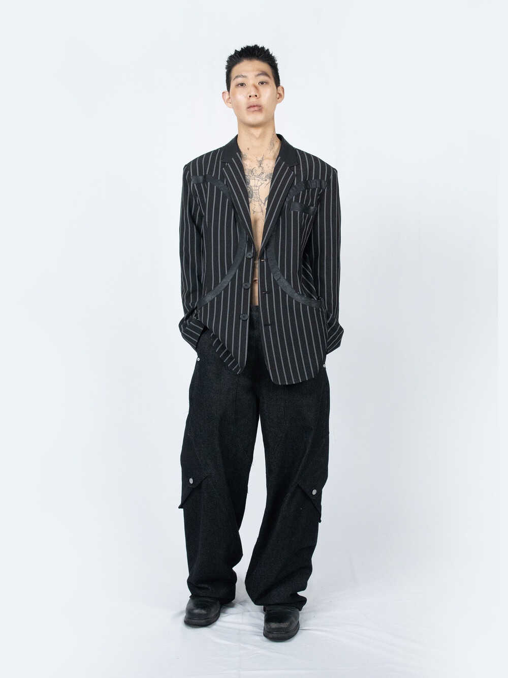 - A striped fabric blazer featuring FULLOFSSUN’s signature circle detail in a leather patch.