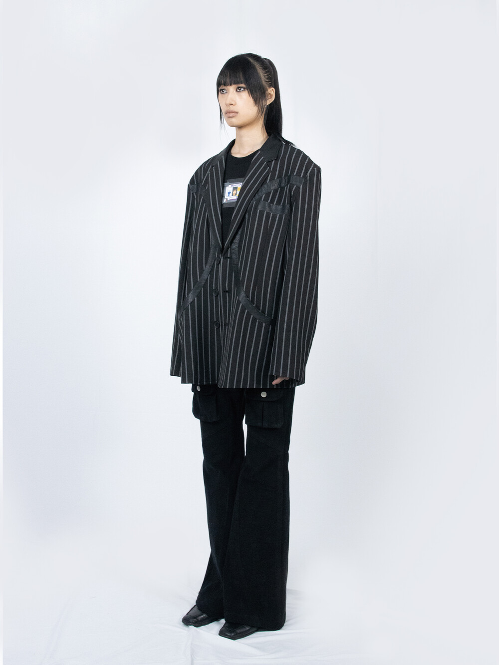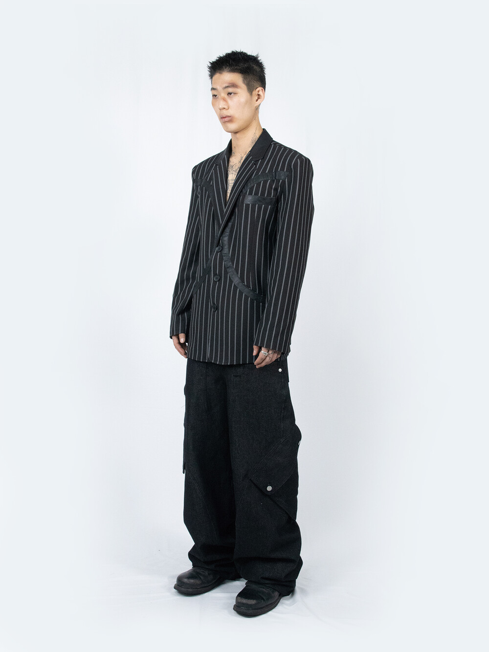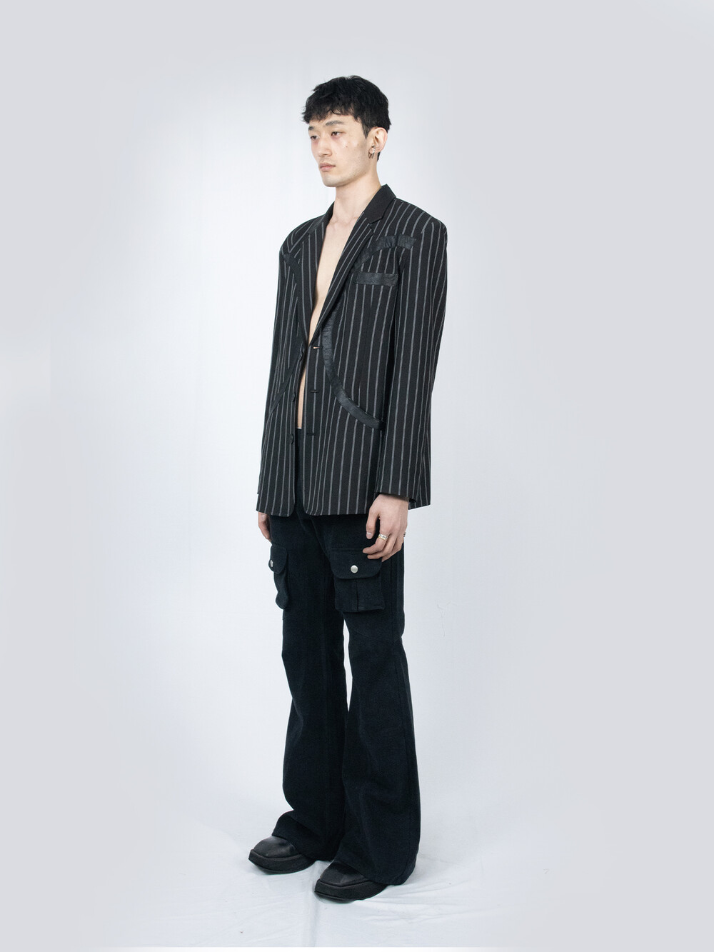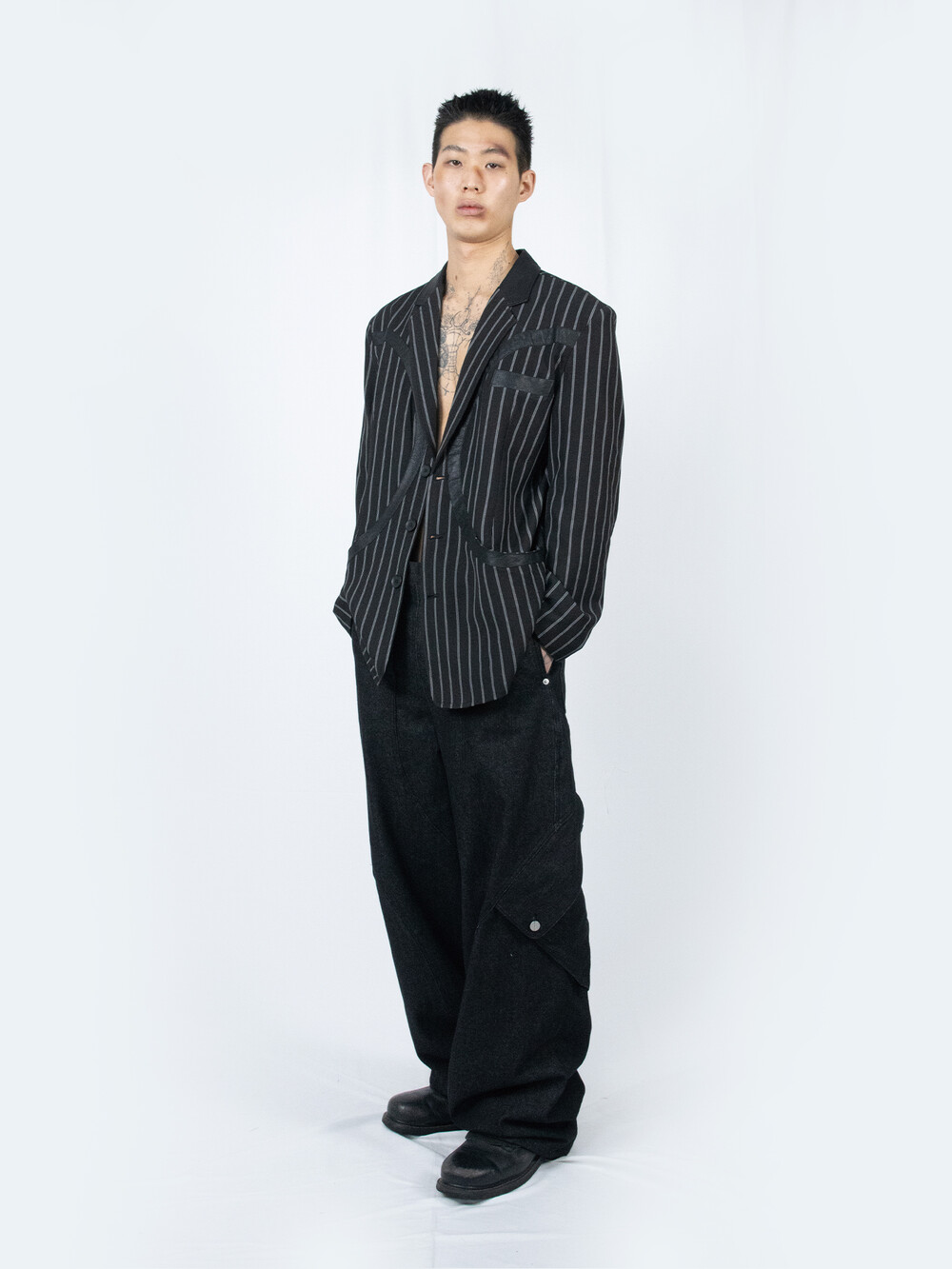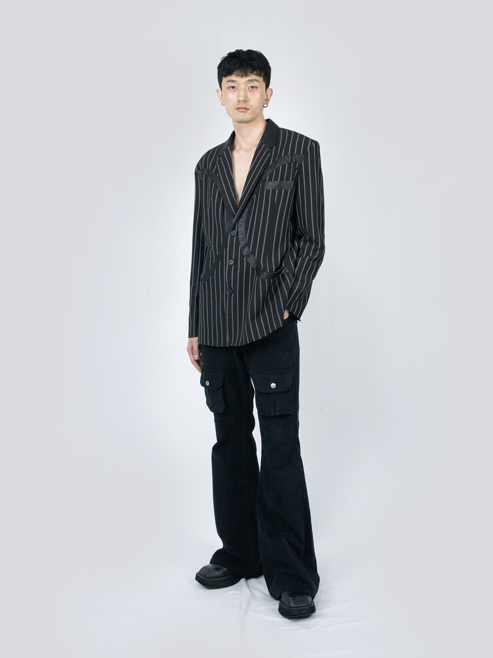 - A striped fabric blazer featuring FULLOFSSUN’s signature circle detail in a leather patch.