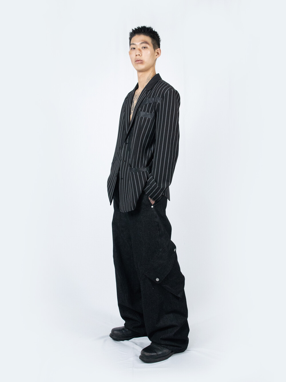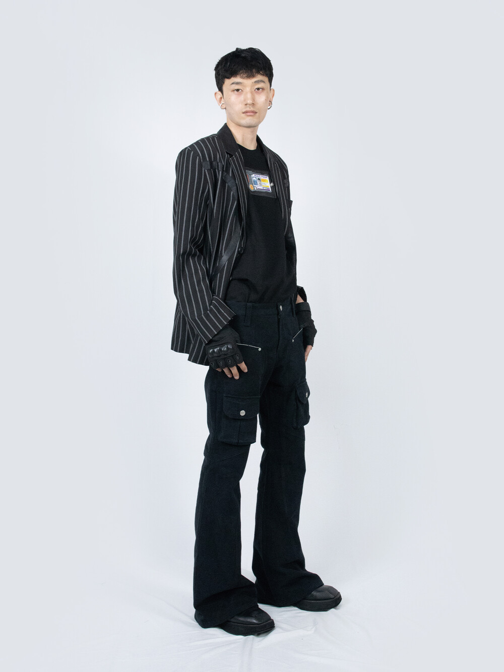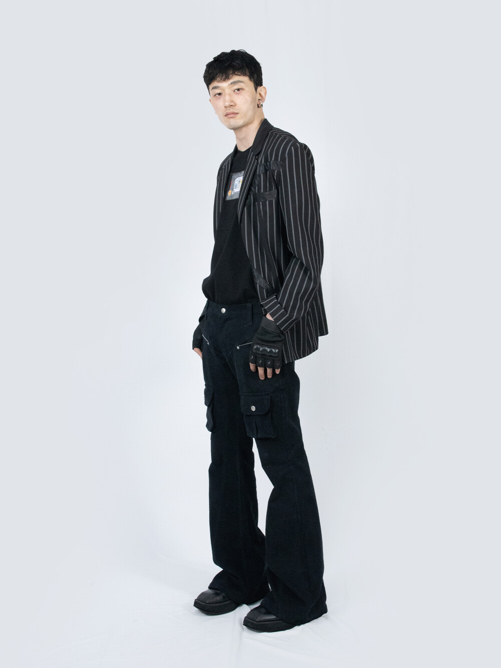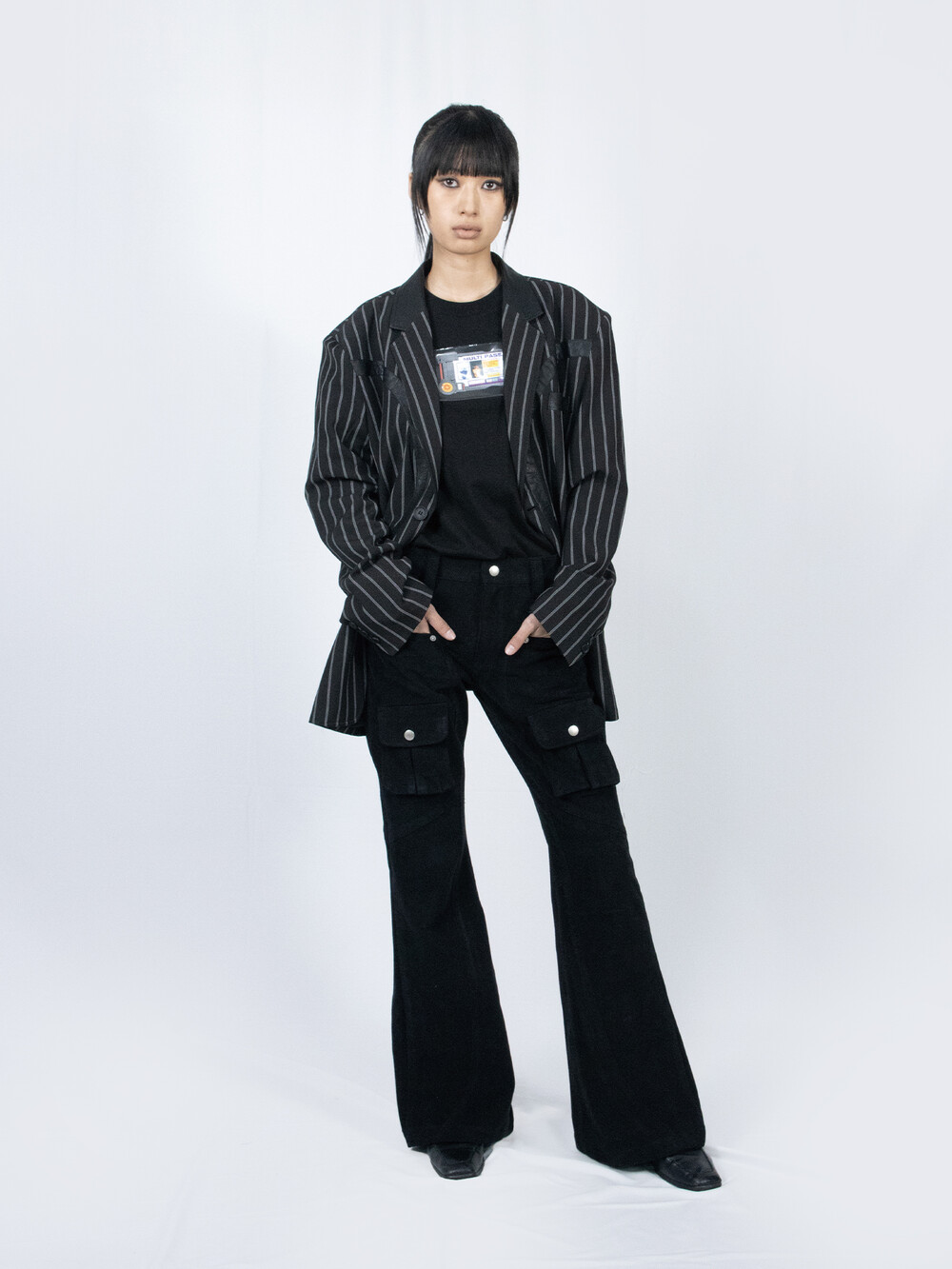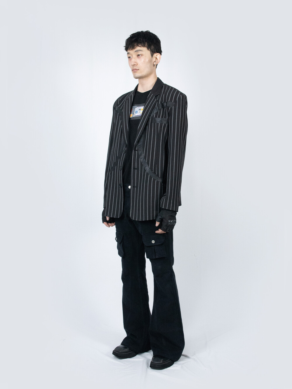 - A striped fabric blazer featuring FULLOFSSUN’s signature circle detail in a leather patch.
