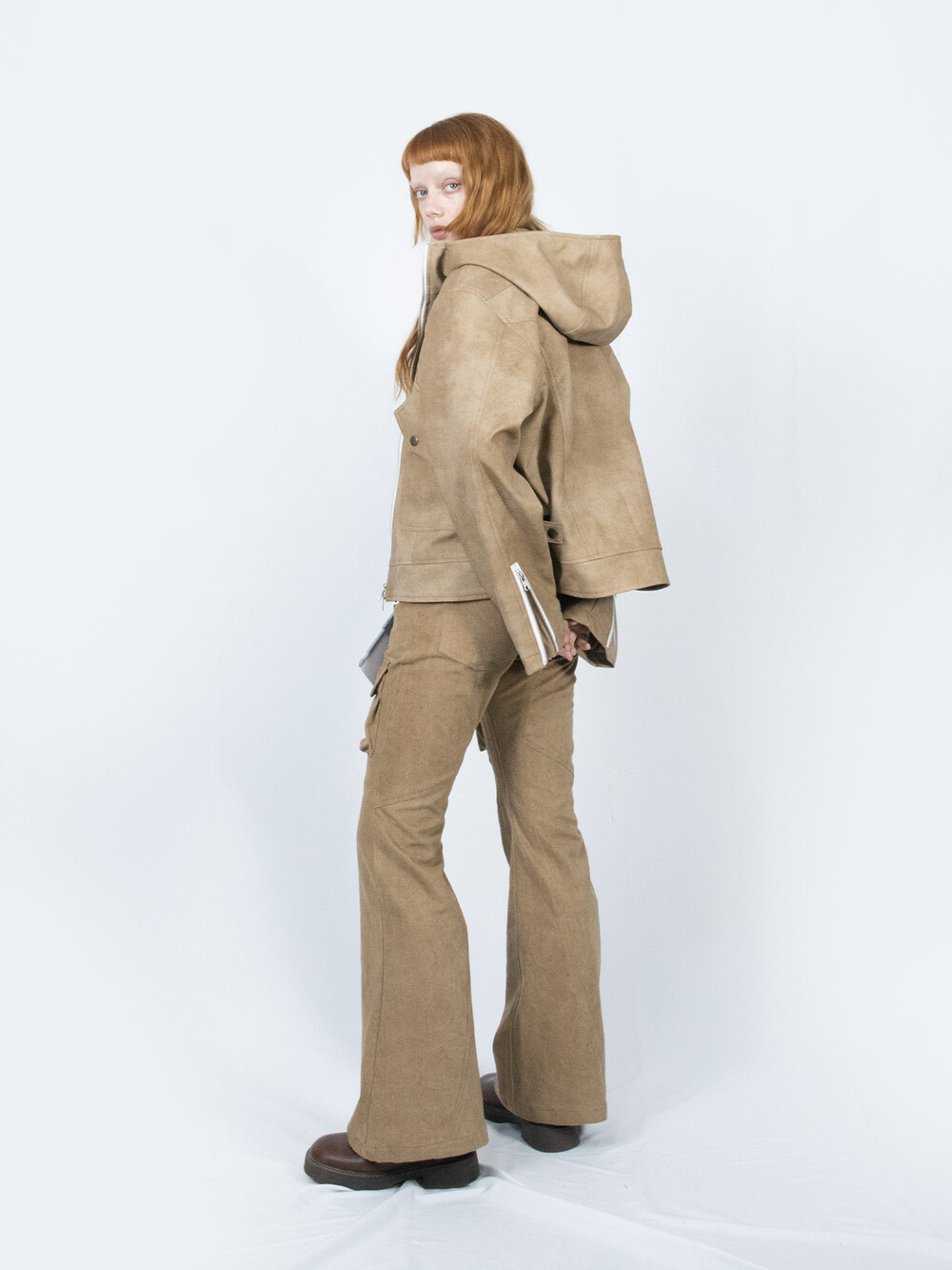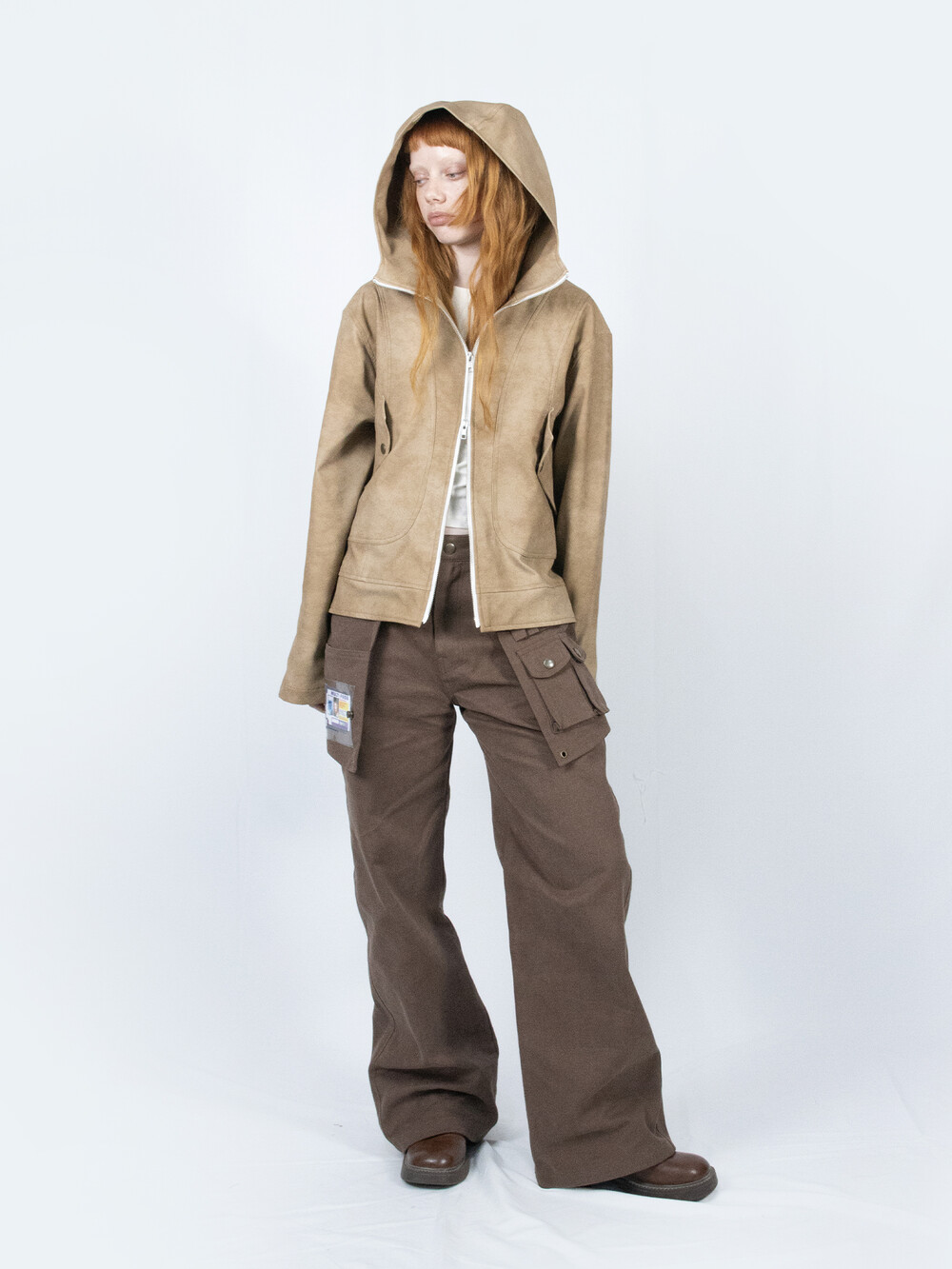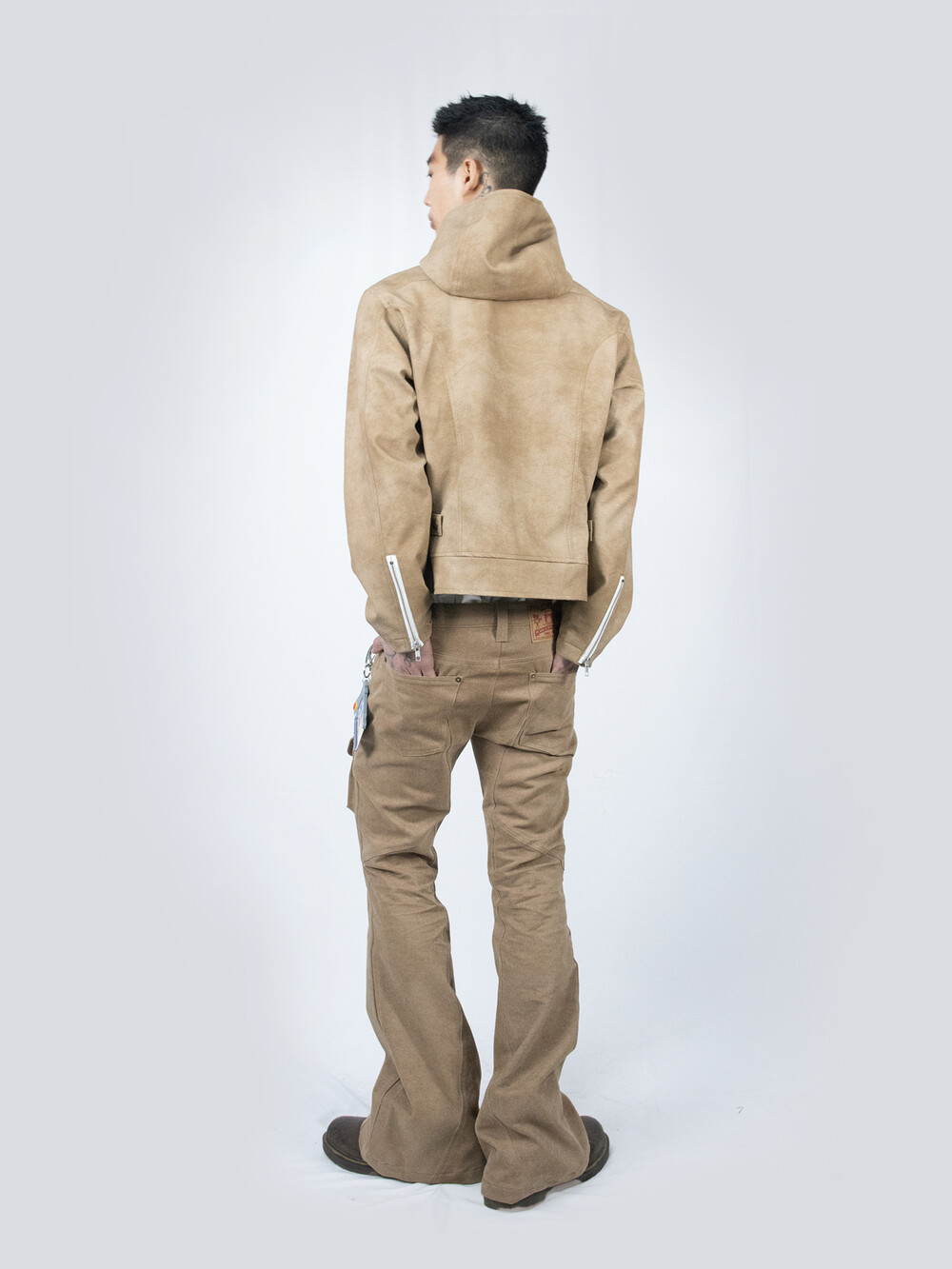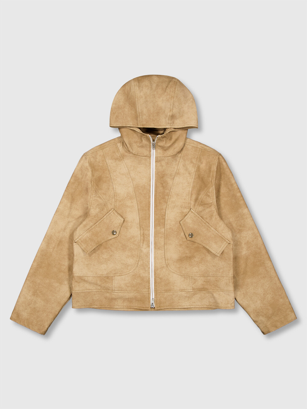 - A hooded leather jacket featuring curved panel detailing on the front, made from faux leather fabric.