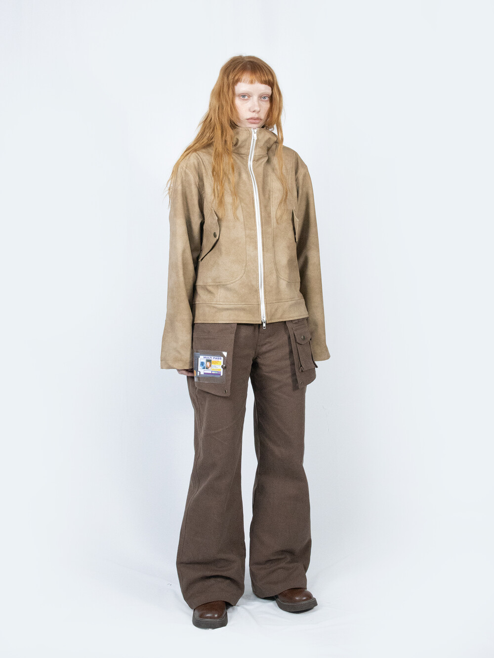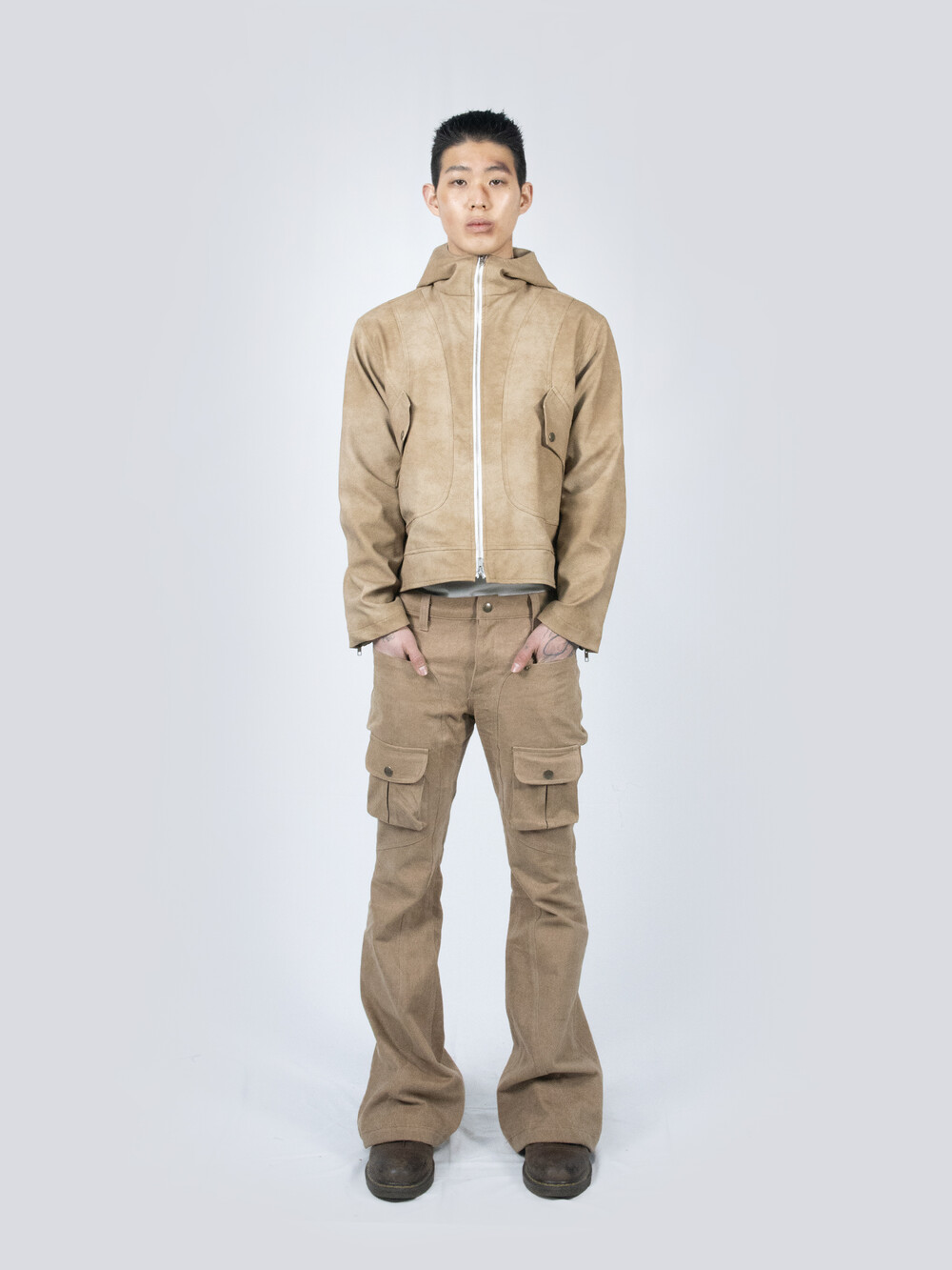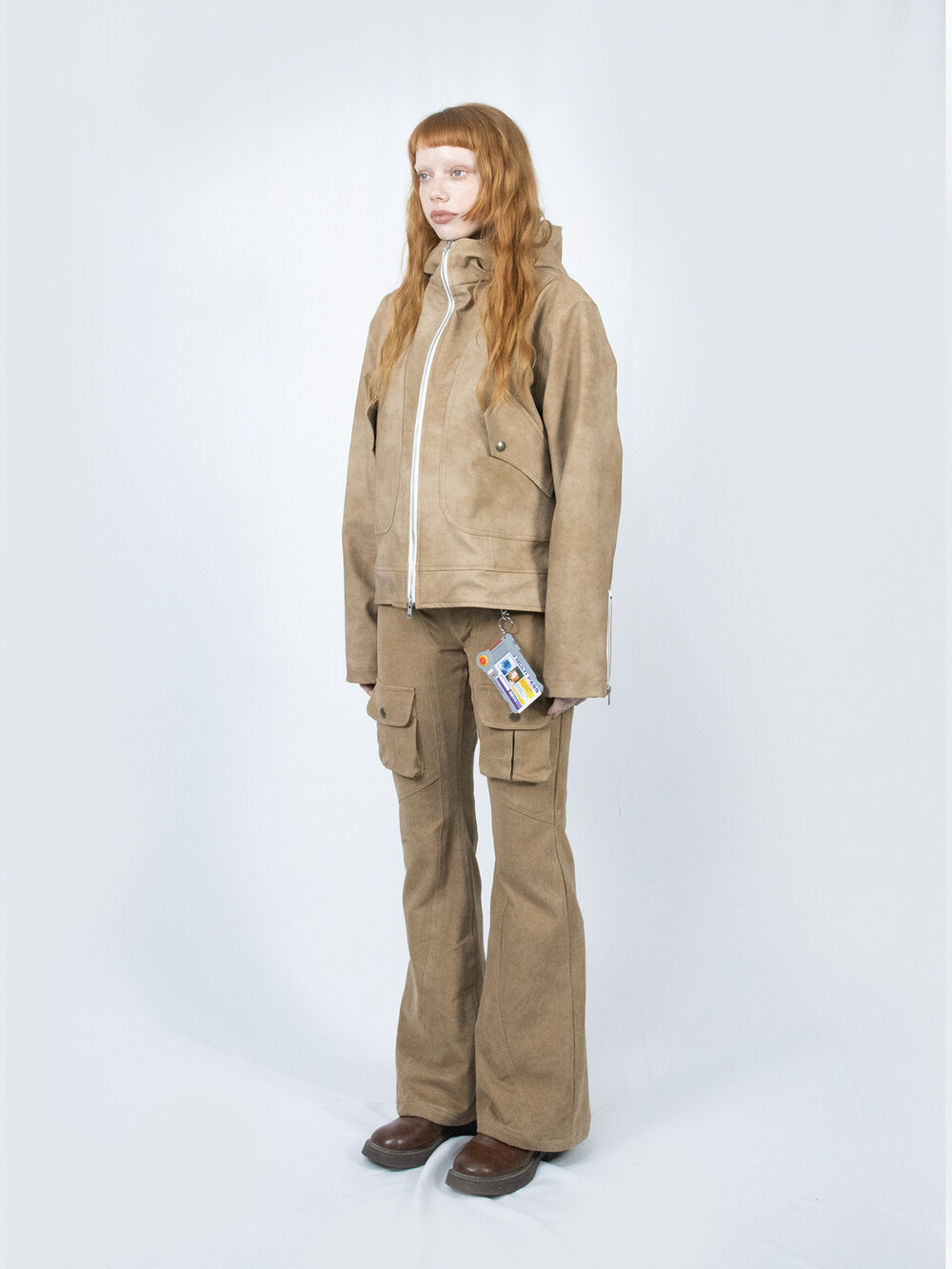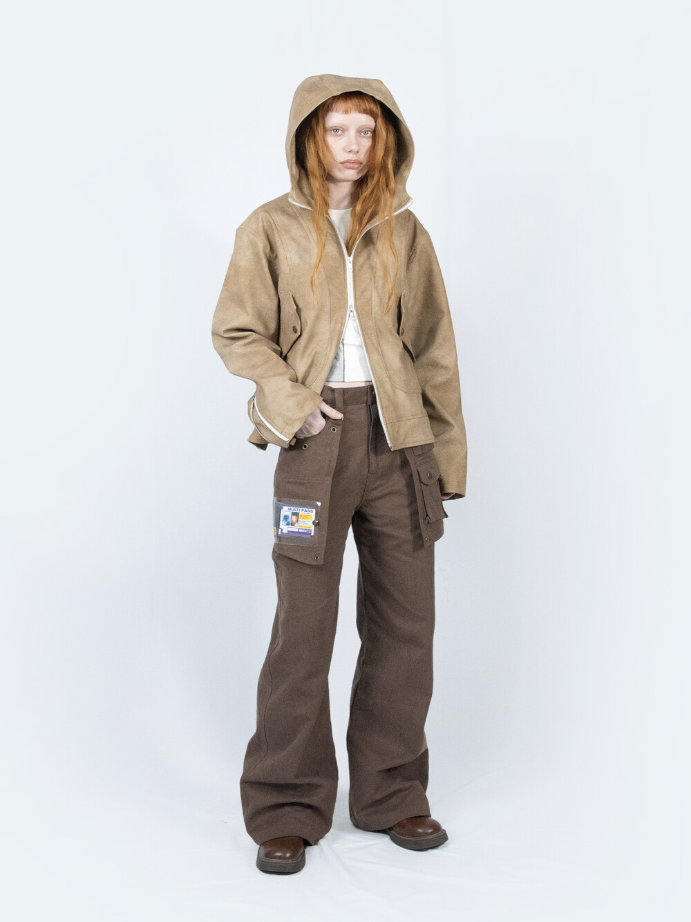 - A hooded leather jacket featuring curved panel detailing on the front, made from faux leather fabric.