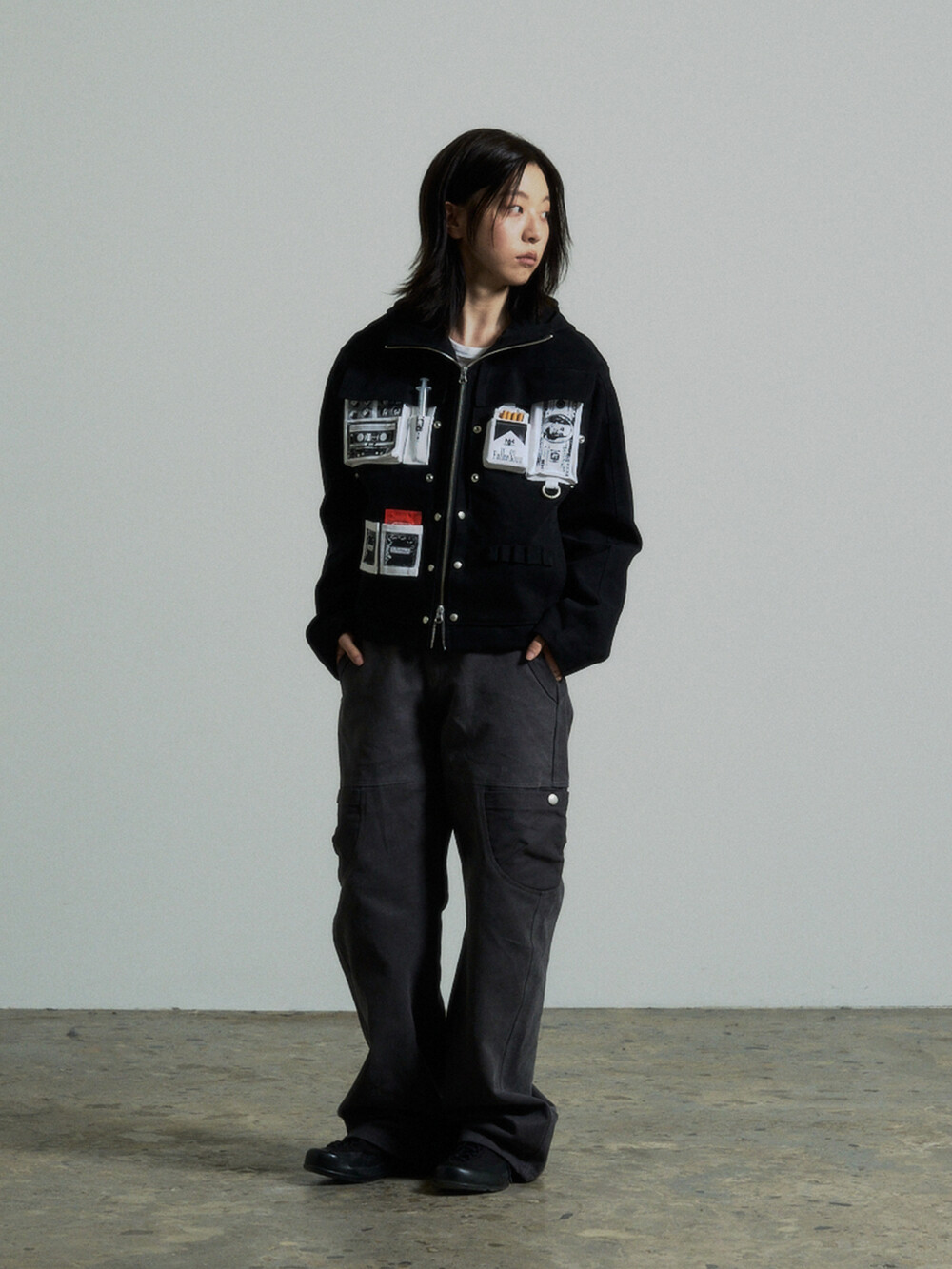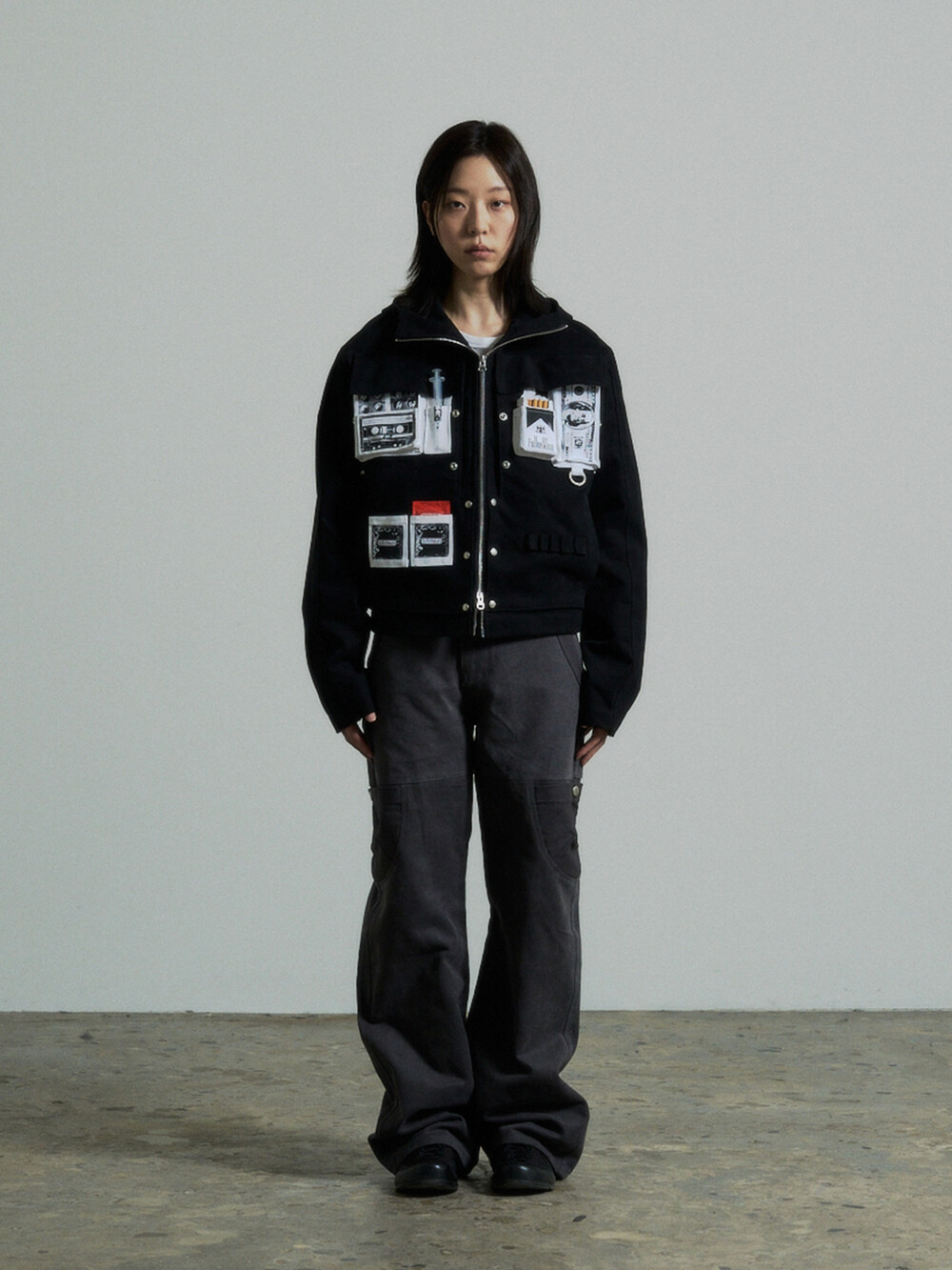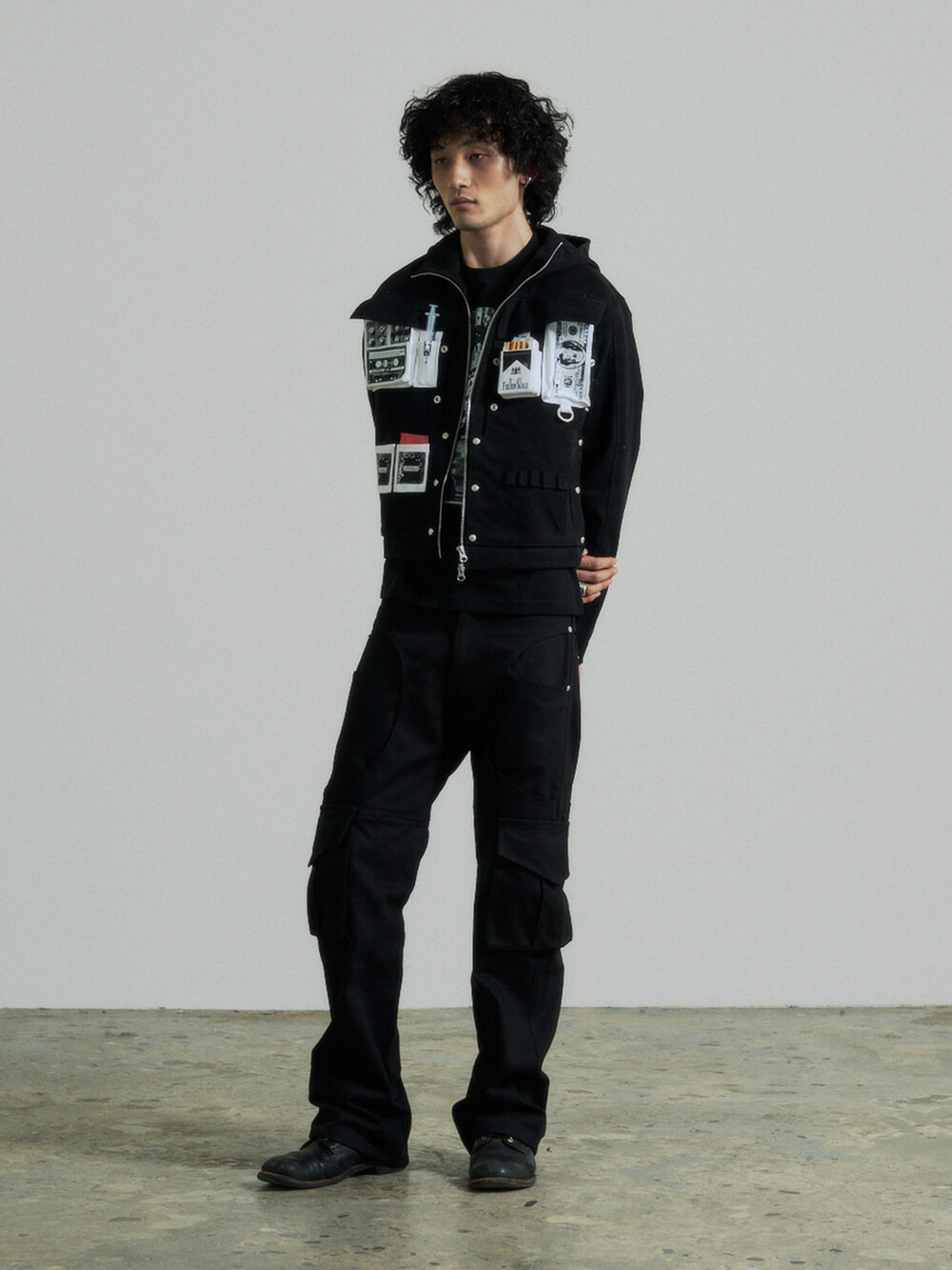 Hidden Fold Printed Multi-pocket Jacket (Black)