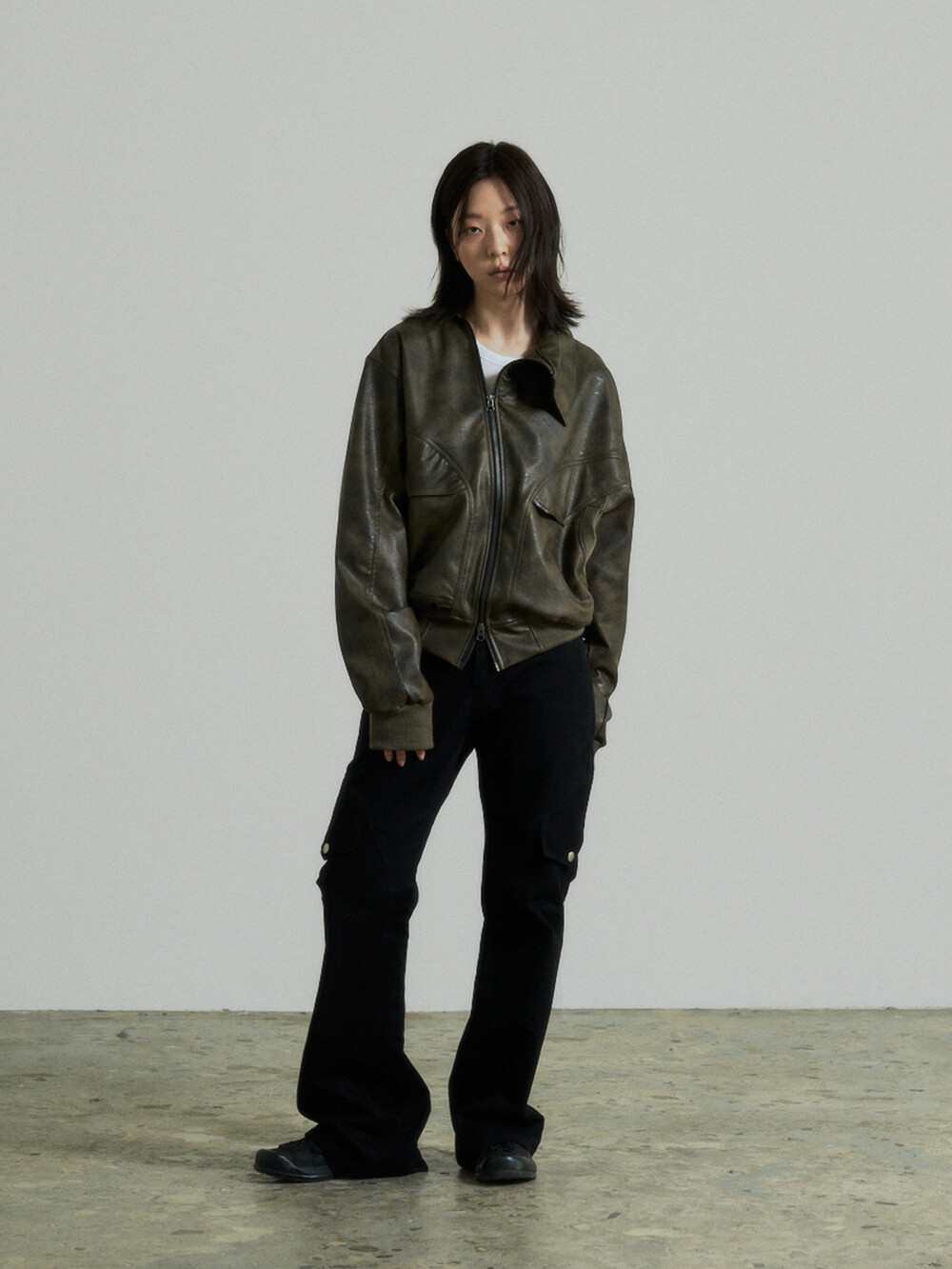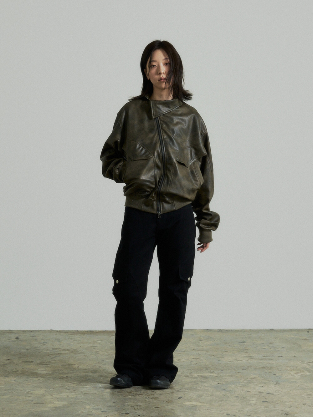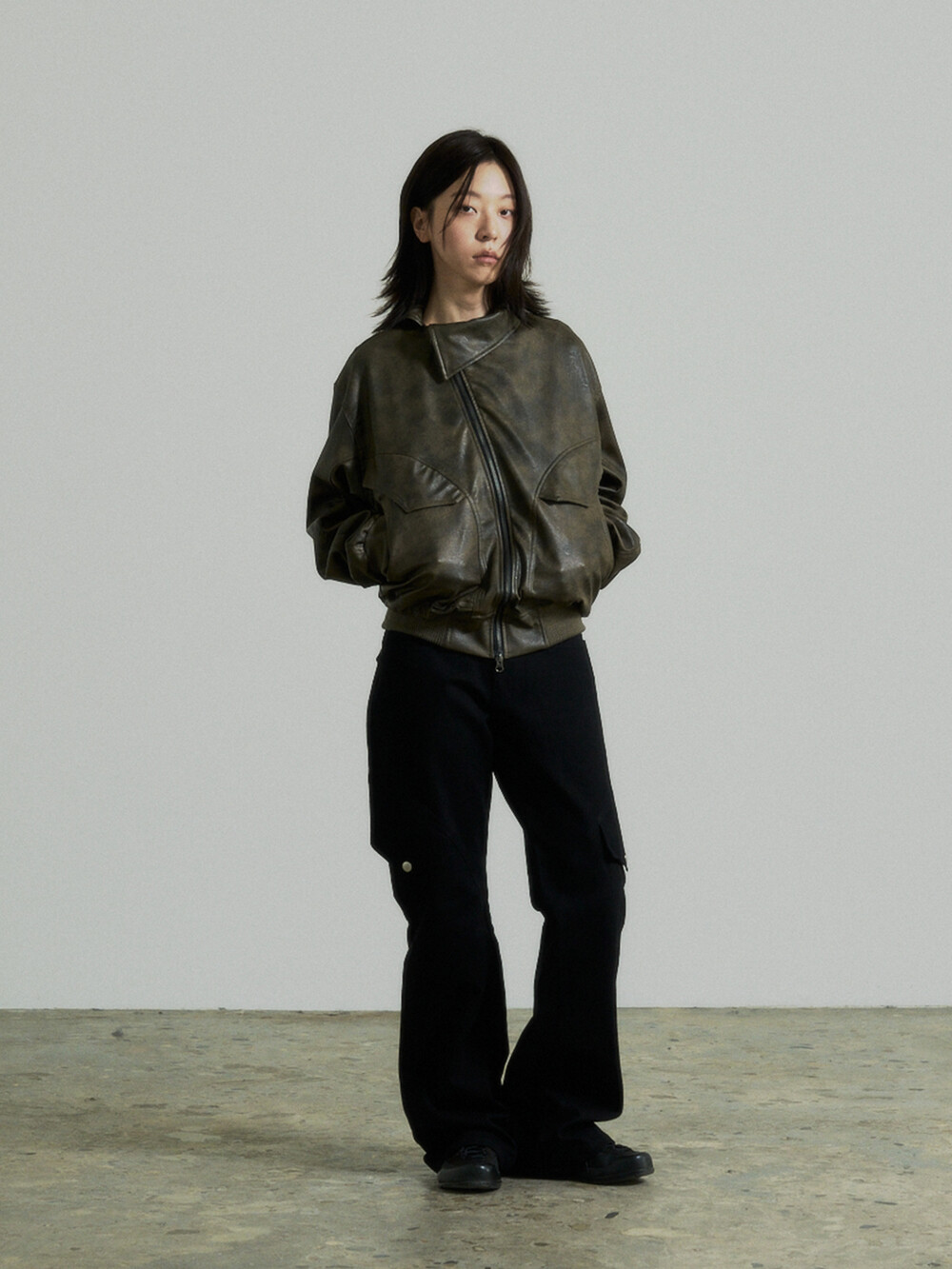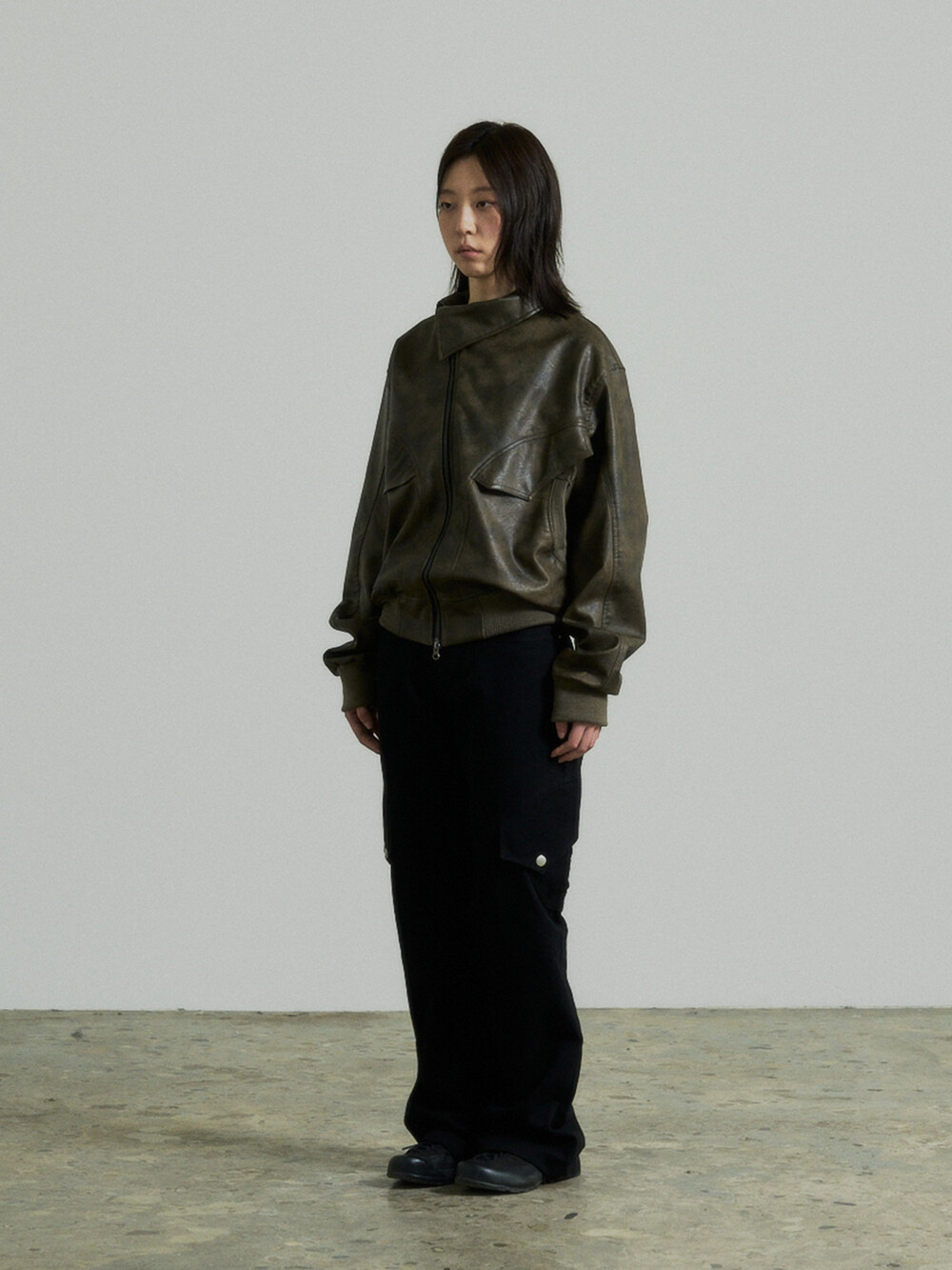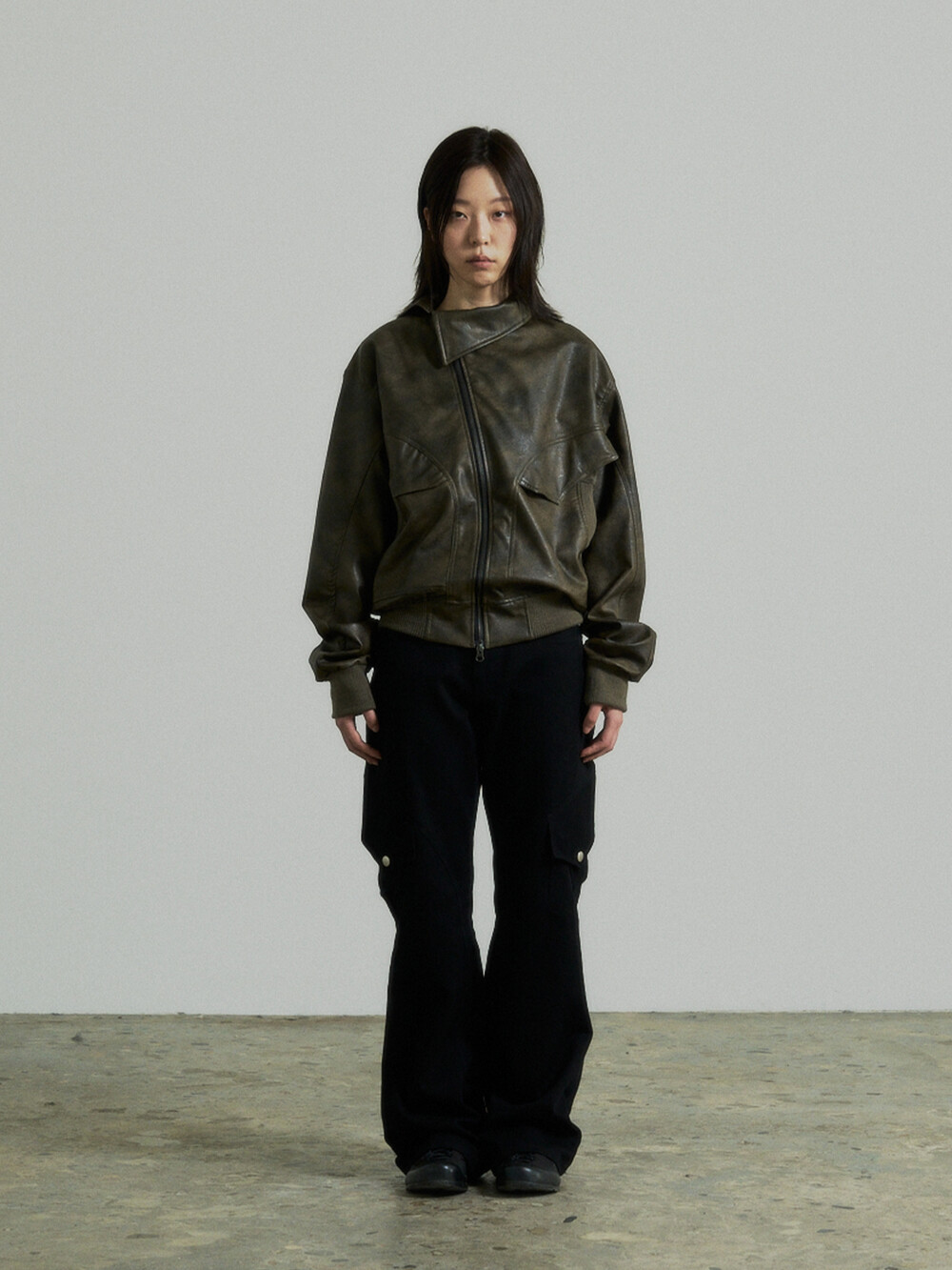 - This is a two-way faux leather jacket featuring an unbalanced design detail.