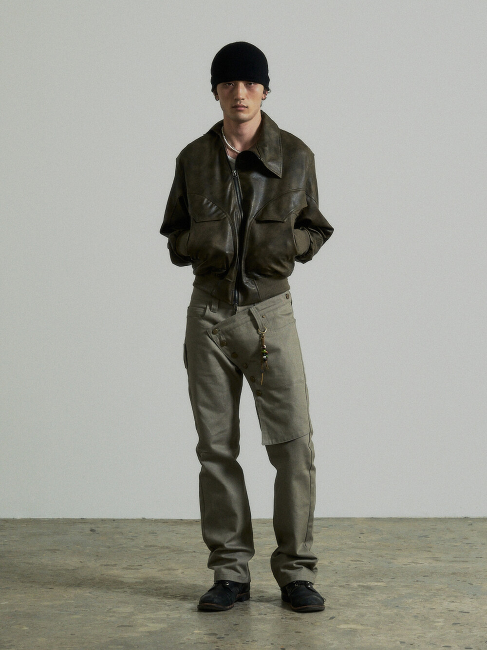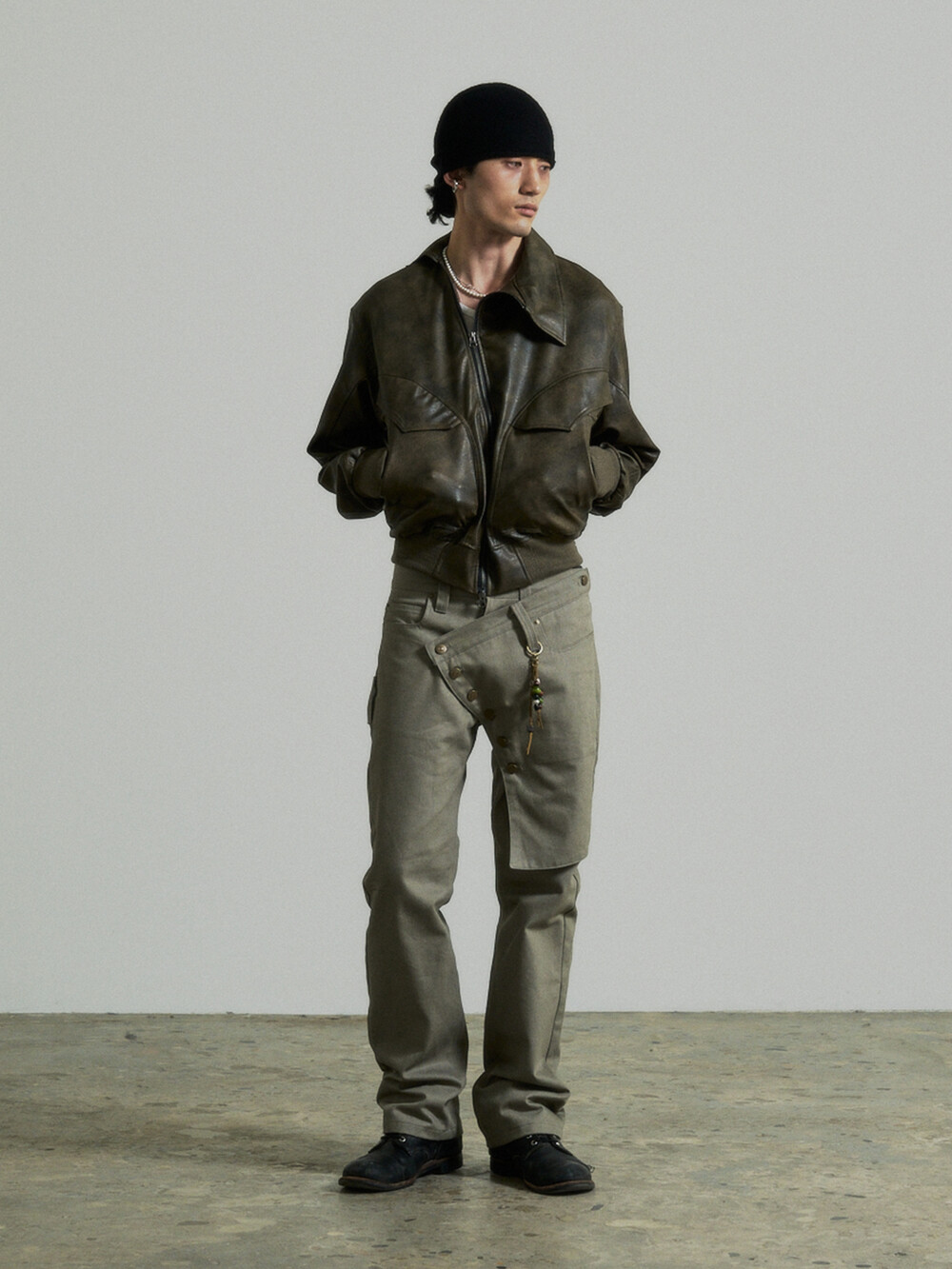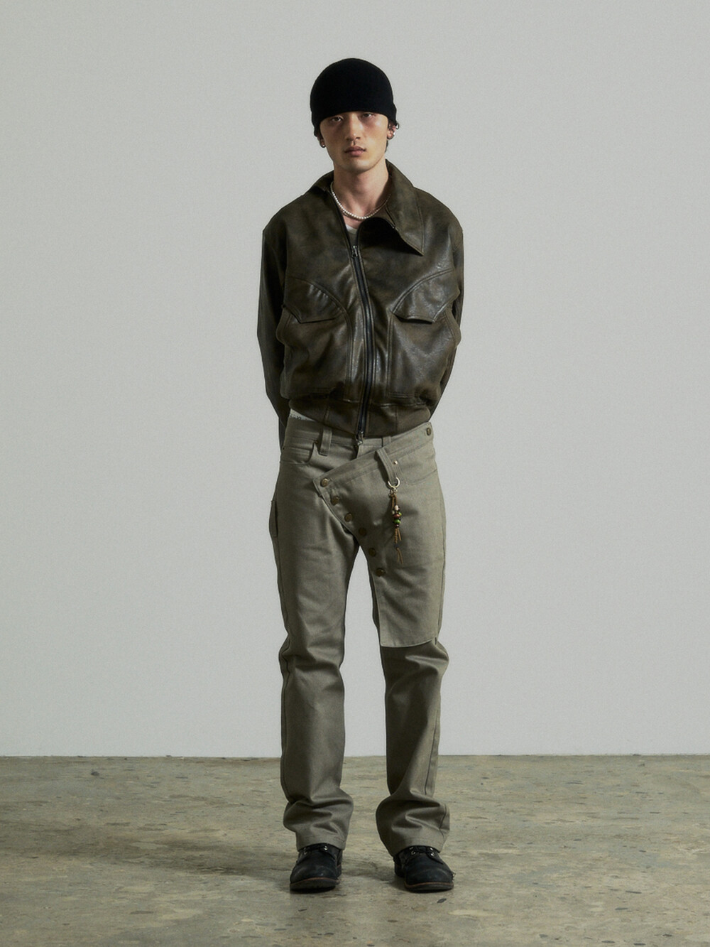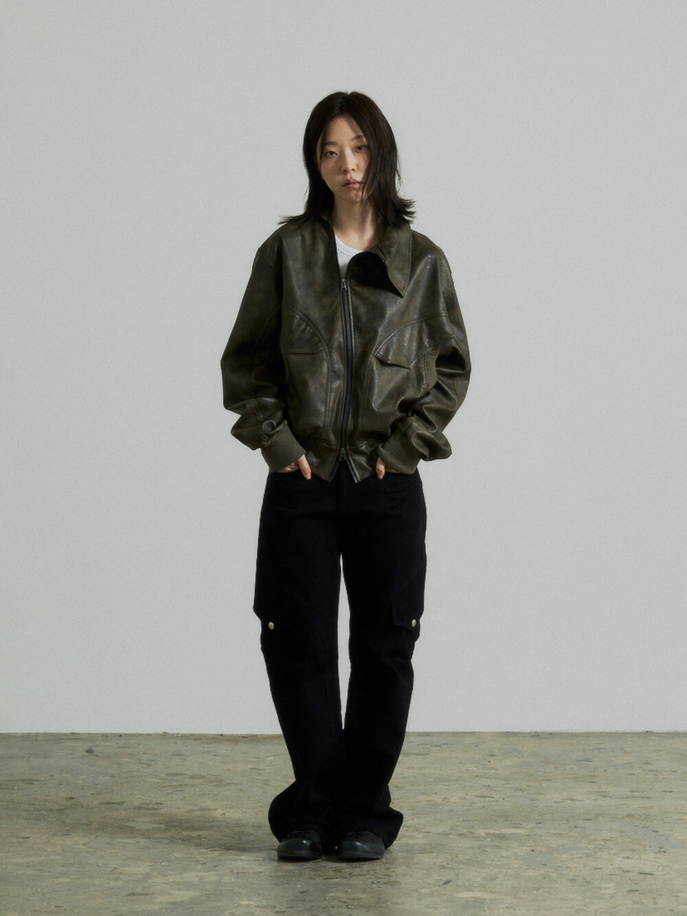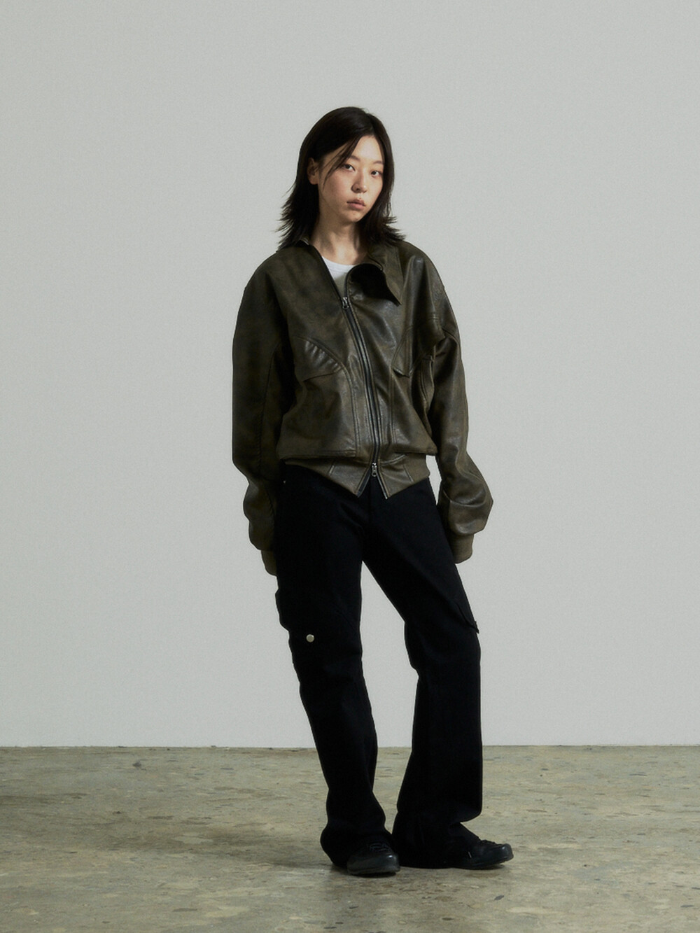 - This is a two-way faux leather jacket featuring an unbalanced design detail.