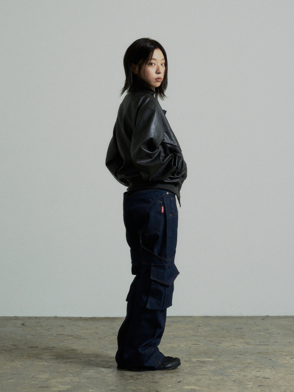 - This is a two-way faux leather jacket featuring an unbalanced design detail.